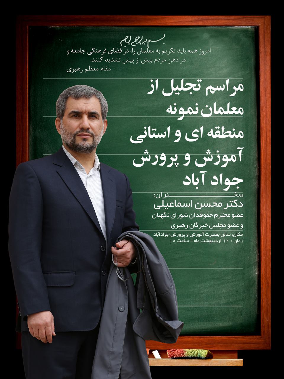 مراسم تجلیل از معلمان نمونه منطقه ای و استانی آموزش و پرورش جوادآباد ورامین با سخنرانی جناب آقای دکتر محسن اسماعیلی عضو حقوقدان شورای نگهبان و عضو مجلس خبرگان رهبری روز یکشنبه 12 اردیبهشت ماه از ساعت 10 در سالن بصیرت آموزش و پرورش جوادآباد ورامین برگزار می گردد