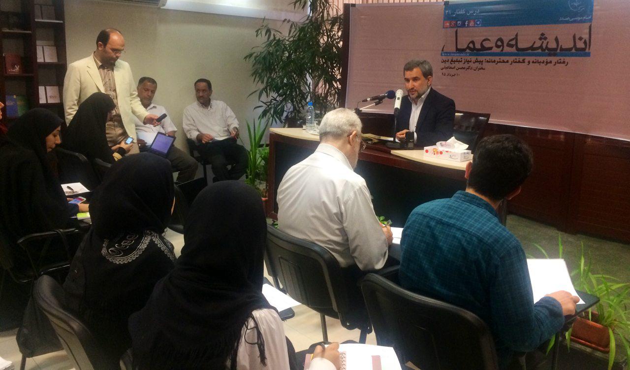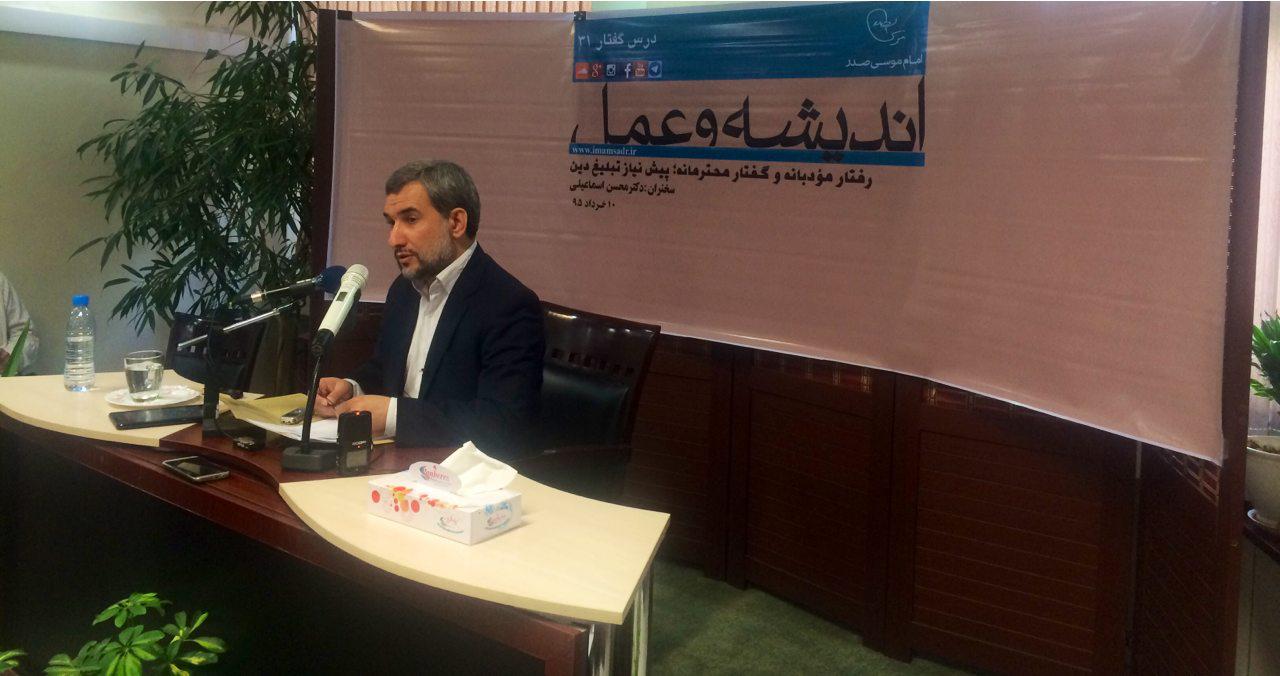 دكتر محسن اسماعيلي در سی‌ویکمین نشست اندیشه و عمل با موضوع «رفتار مؤدبانه و گفتار محترمانه؛ پیش نیاز تبلیغ دین» در محل موسسه فرهنگي تحقيقاتي امام موسي صدر، افزود: مبلغان دين قبل از گفتارشان بايد رفتارشان مودبانه باشد. قبل از گفتار، بايد عمل را درست كرد؛ چراكه ناهماهنگي ميان گفتار و كردار، بزرگترين ضربه اعتقادي را به مخاطب خواهد زد. همين كه مخاطب، رفتار با عقلانيت و ادب را ببيند، خودش جذب مي‌شود.